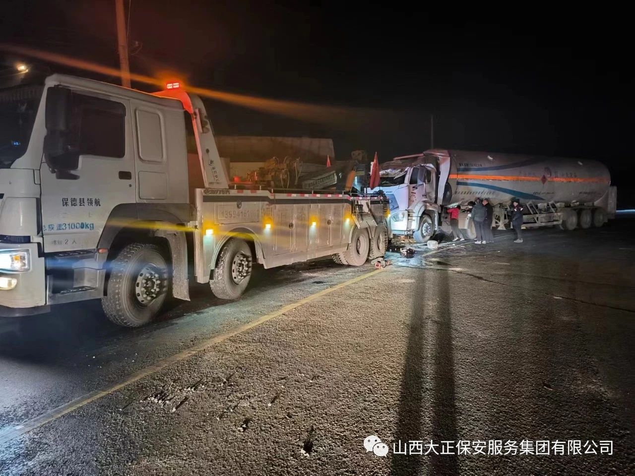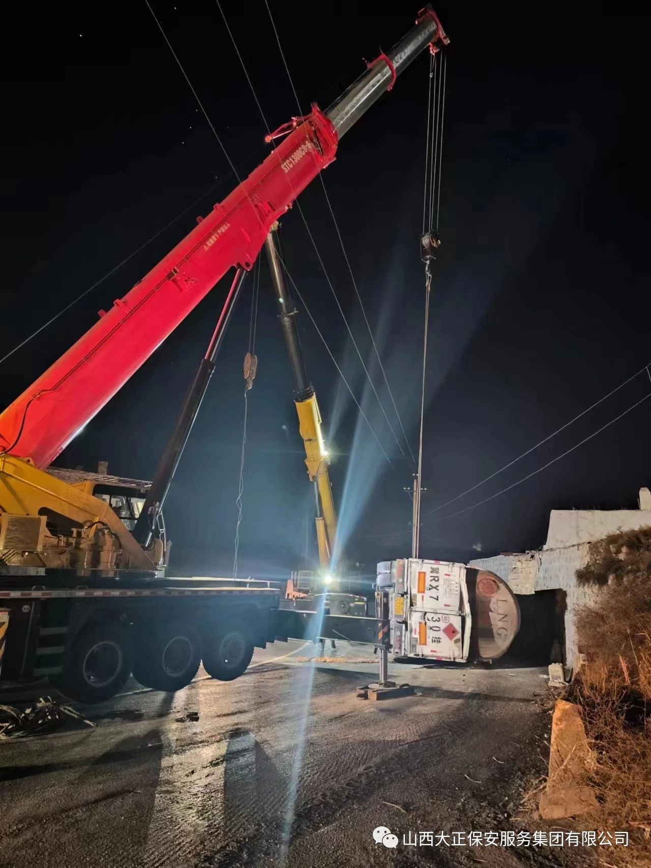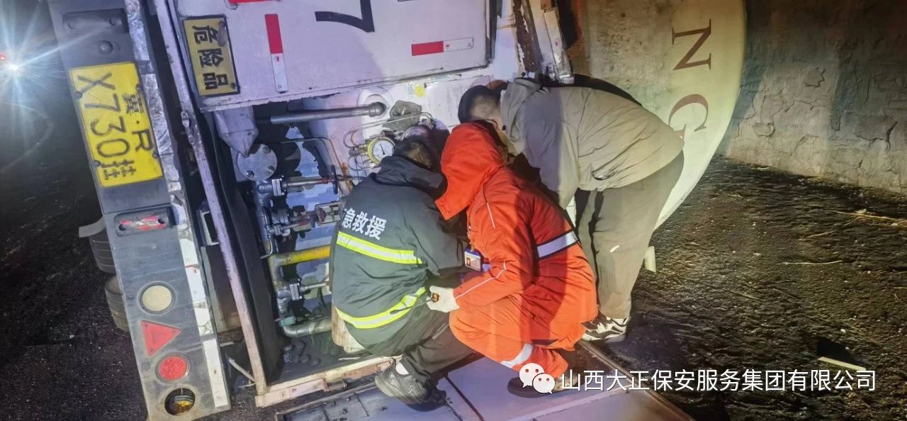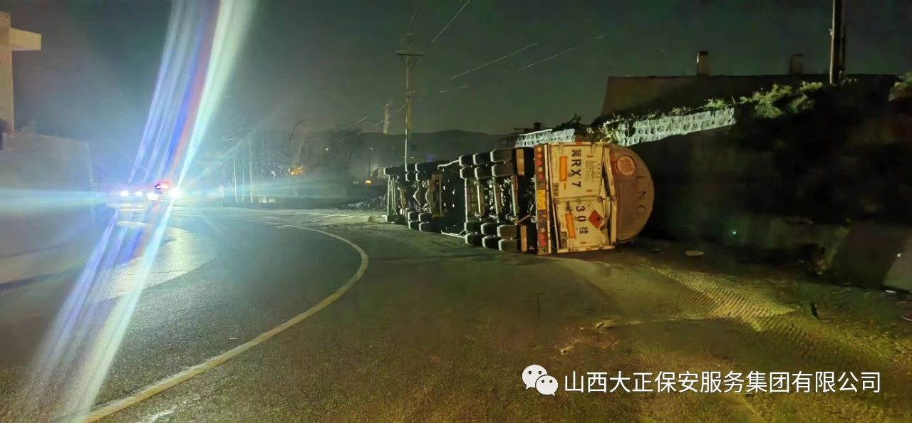 2023年11月23日晚8時,山西大正保安集團公司保德縣守押中隊應急救援大隊接到應急局出勤指令,棗林坡有滿載液化氣罐車發(fā)生側翻,需要派出應急人員控制現(xiàn)場,并協(xié)助處理側翻事故。應急救援大隊接到命令后,派出應急車輛兩部及應急人員5人趕赴現(xiàn)場,協(xié)助交警對現(xiàn)場路段進行管控,保證周圍車輛人員安全。